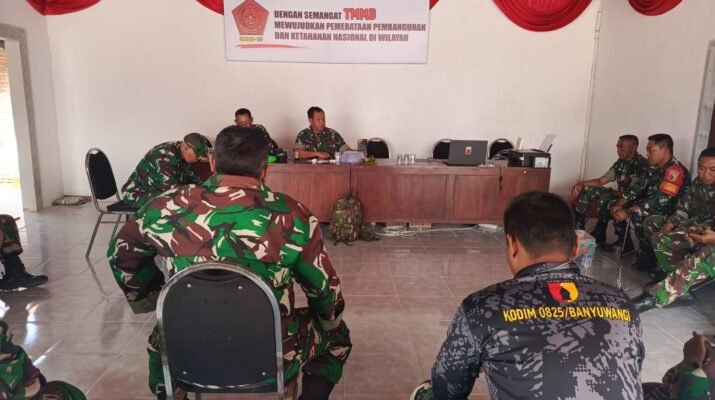 Banyuwangi – Satgas TNI Manunggal Membangun Desa (TMMD) Kodim 0825/Banyuwangi melaksanakan rapat evaluasi sekaligus mempersiapkan pelaksanaan penutupan TMMD. Kegiatan ini berlangsung di Makodim 0825/Banyuwangi