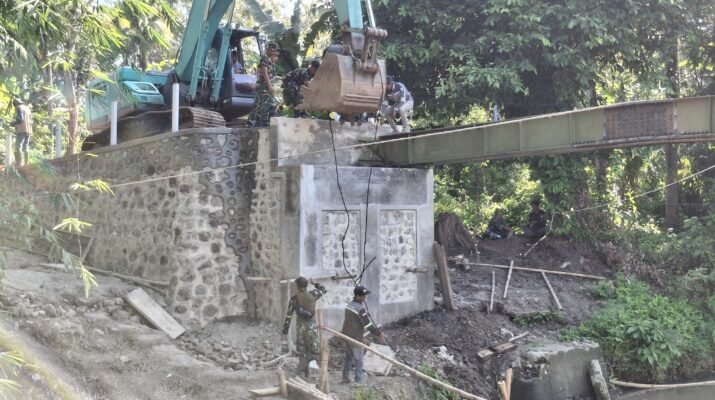 Progres Pembangunan Jembatan TMMD 125 Memasuki Tahap Krusial, Satgas Mulai Pasang Rangka Besi Penghubung Pondasi