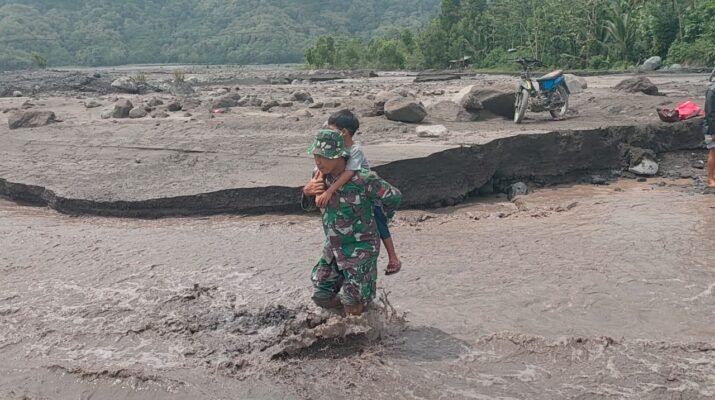 Lumajang – Kepedulian TNI terhadap keselamatan masyarakat kembali terlihat di wilayah terdampak erupsi Gunung Semeru. Bati Tuud Koramil 0821-15/Tekung, Pelda Rudi Rusmianto, bersama empat