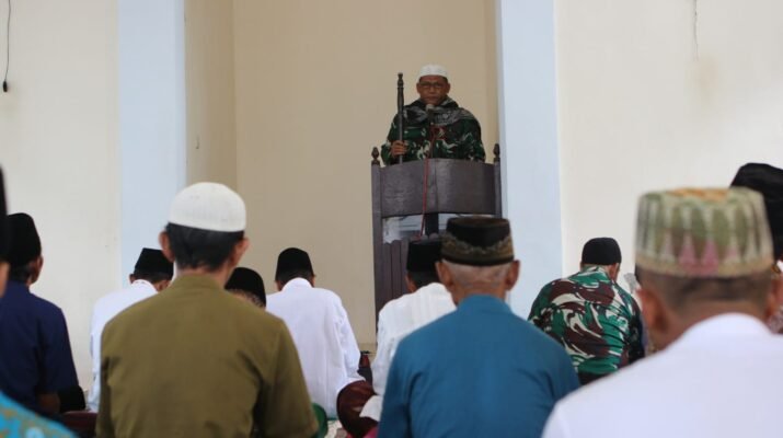 Siliragung, Banyuwangi – Kegiatan TNI Manunggal Membangun Desa (TMMD) ke-125 Tahun Anggaran 2025 Kodim 0825/Banyuwangi terus berlanjut tidak hanya dalam bentuk pembangunan fisik, tetapi juga pembinaan mental dan spiritual masyarakat. Salah satu bentuknya adalah pelaksanaan Sholat Jum’at yang dipimpin langsung oleh Serka Suin, anggota Bintal Korem 083/Bdj, di Masjid Riyadlussholihin, Dusun Silirsari, Desa Kesilir, Kecamatan Siliragung, Jum’at (01/08/2025).