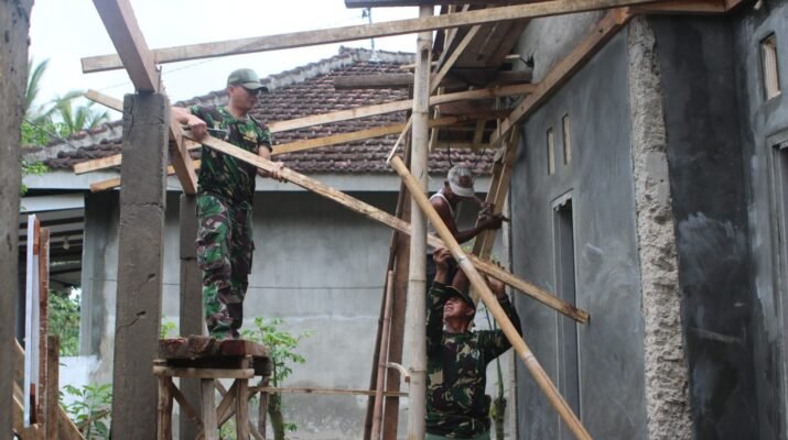 Pagi ini, tampak anggota Satgas TMMD bersama warga setempat bahu-membahu menyusun rangka atap rumah yang kini sedang dalam proses perbaikan menyeluruh. Rumah Ibu Sulami yang sebelumnya mengalami kerusakan cukup parah, kini mulai menunjukkan perubahan signifikan berkat kerja keras dan sinergi antara prajurit TNI dan masyarakat.